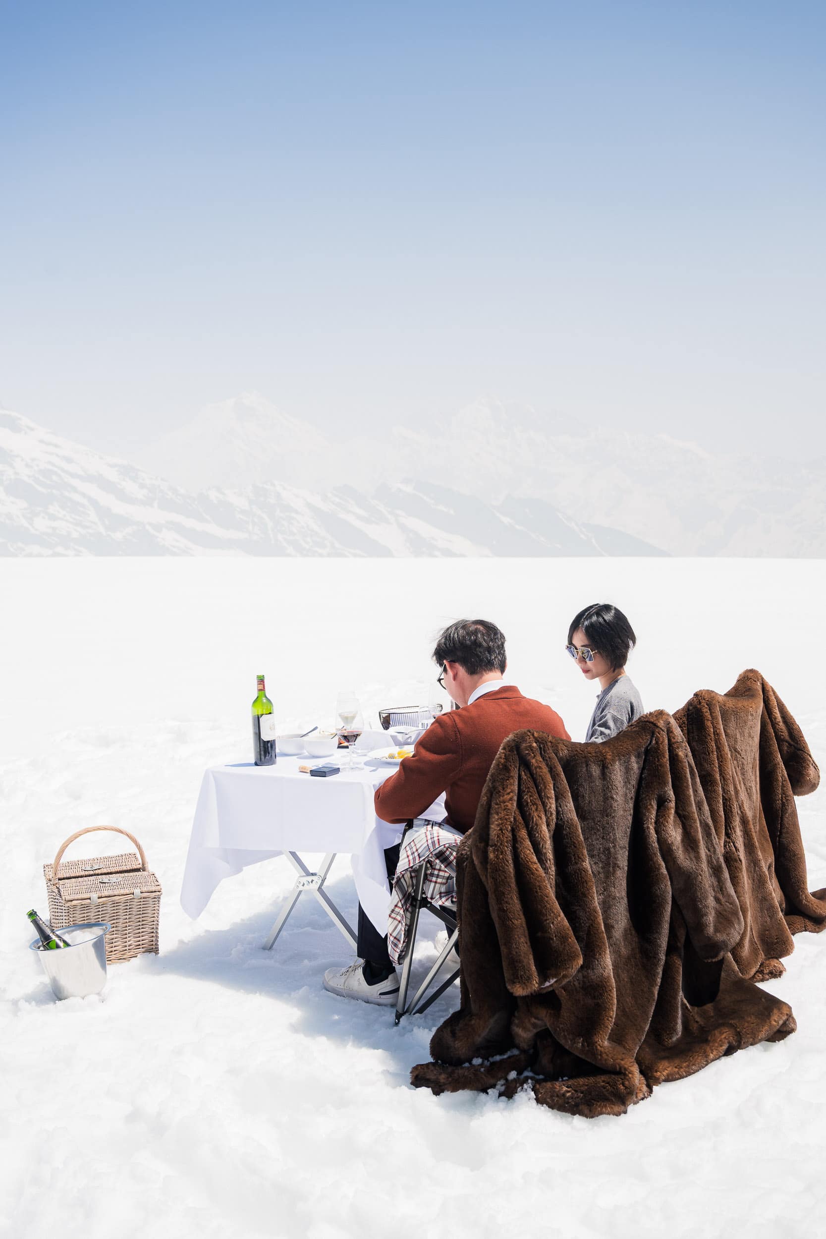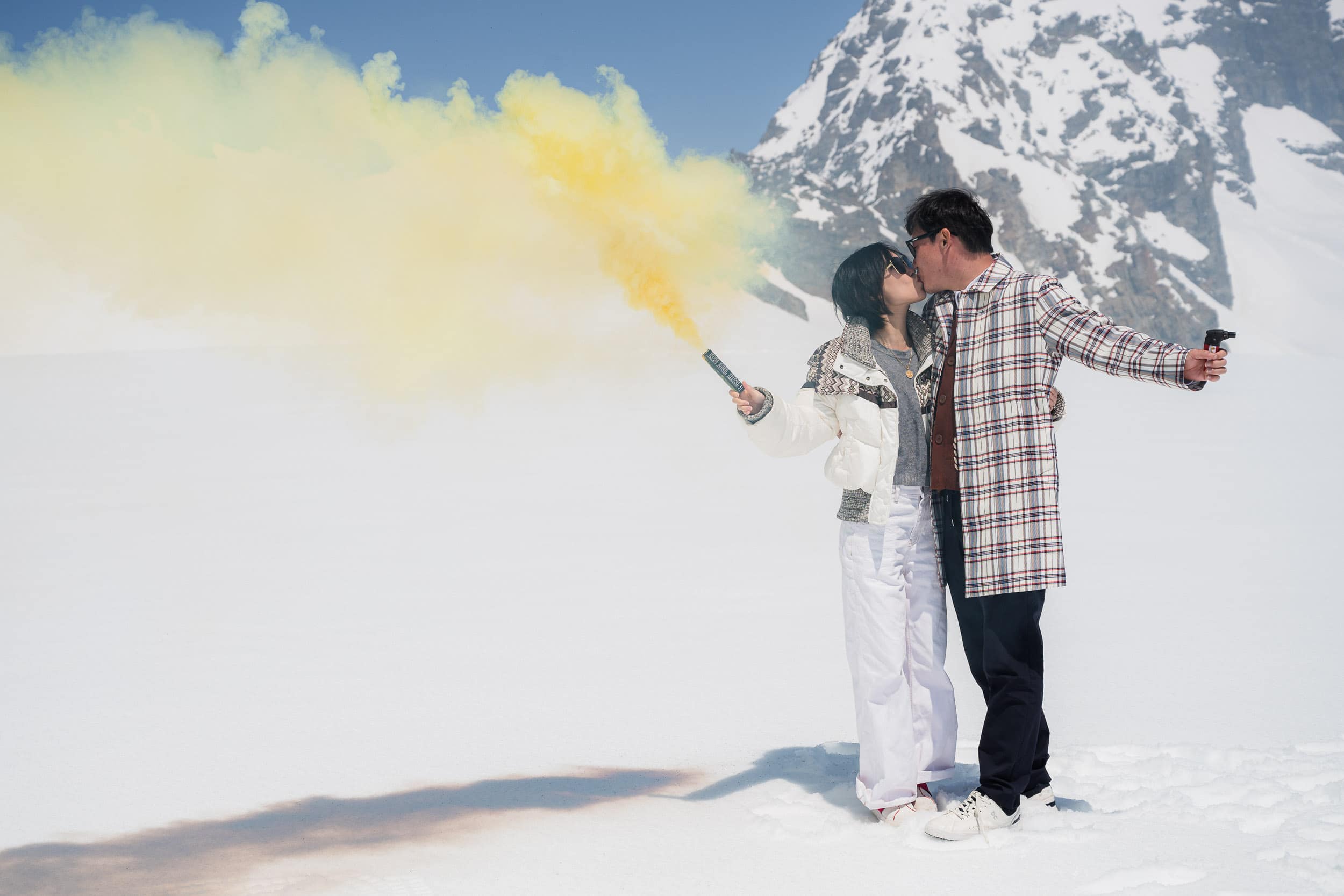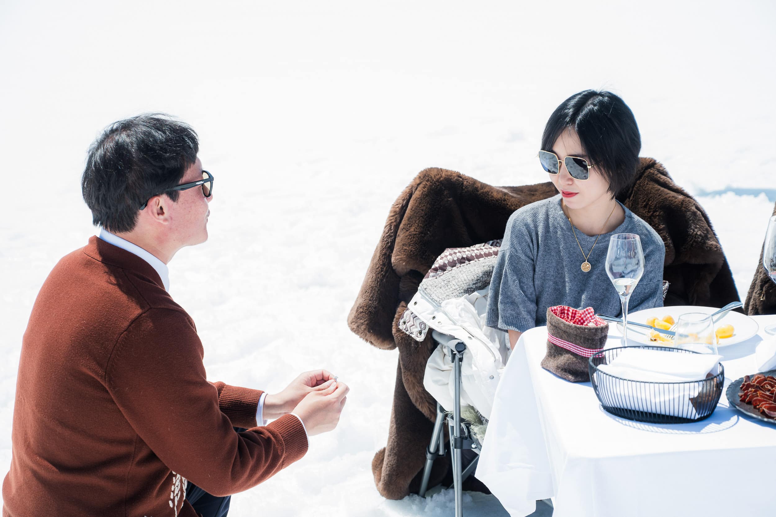 A once-in-a-lifetime helicopter proposal starting at the Bürgenstock and flying to the snow-covered glacier of Petersgrat. The proposal and portrait session took place high in the Alps, surrounded by untouched snow and dramatic mountain scenery. After the proposal, the couple enjoyed an exclusive raclette experience on the mountain, adding a warm and intimate moment to the alpine setting. Back at the Bürgenstock, the experience continued with a relaxed photo session in the spa garden, combining alpine adventure with refined elegance. A discreet and cinematic approach documenting an unforgettable proposal in the heart of Switzerland.