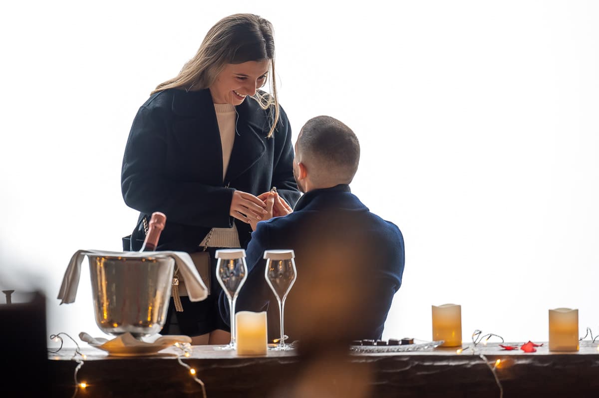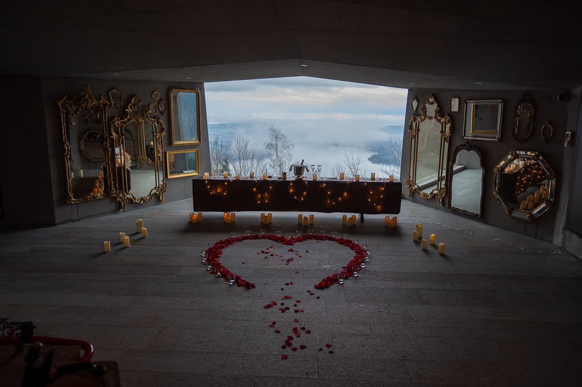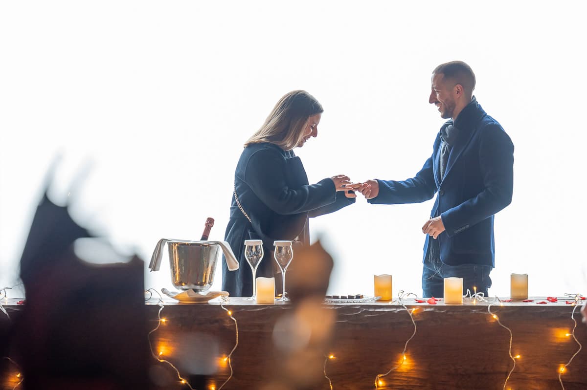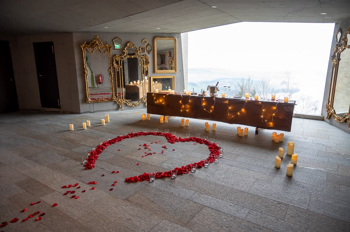 This proposal took place on a quiet January day at the Bürgenstock, one of Switzerland’s most exclusive locations overlooking Lake Lucerne. Inside The Cave, a private and atmospheric space, the setting was carefully prepared with flowers, candles and refined details to create a warm and intimate ambiance.