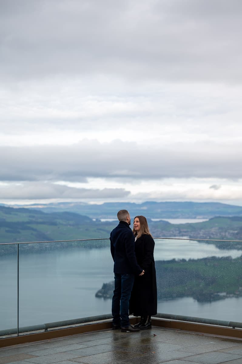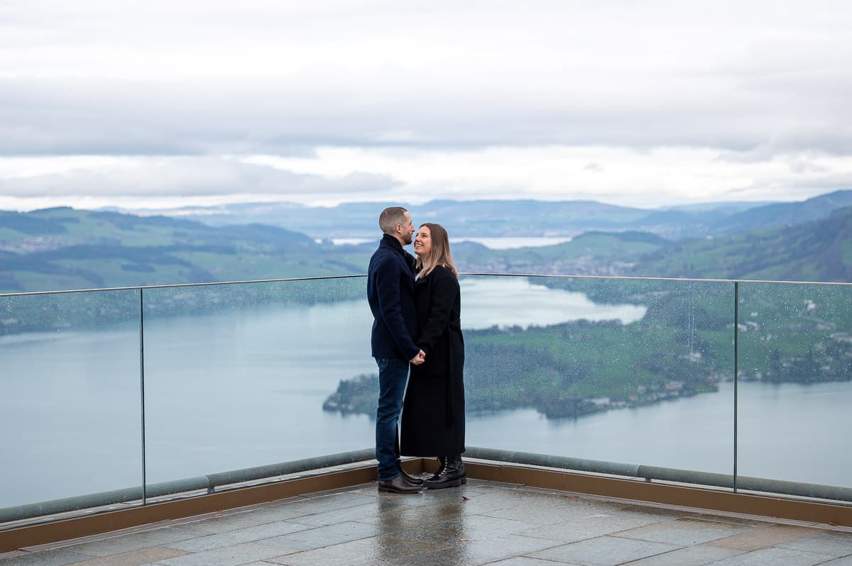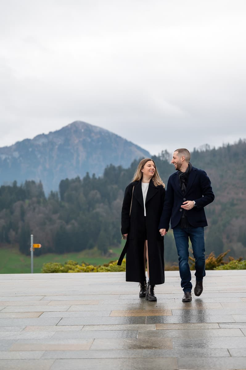 After the proposal, we continued with a relaxed couple photoshoot outdoors. Surrounded by winter light, mountains and the expansive landscape of the Bürgenstock, the focus naturally shifted to connection, emotion and presence rather than staged moments. The contrast between the cozy interior and the open alpine scenery made this experience especially unique.
